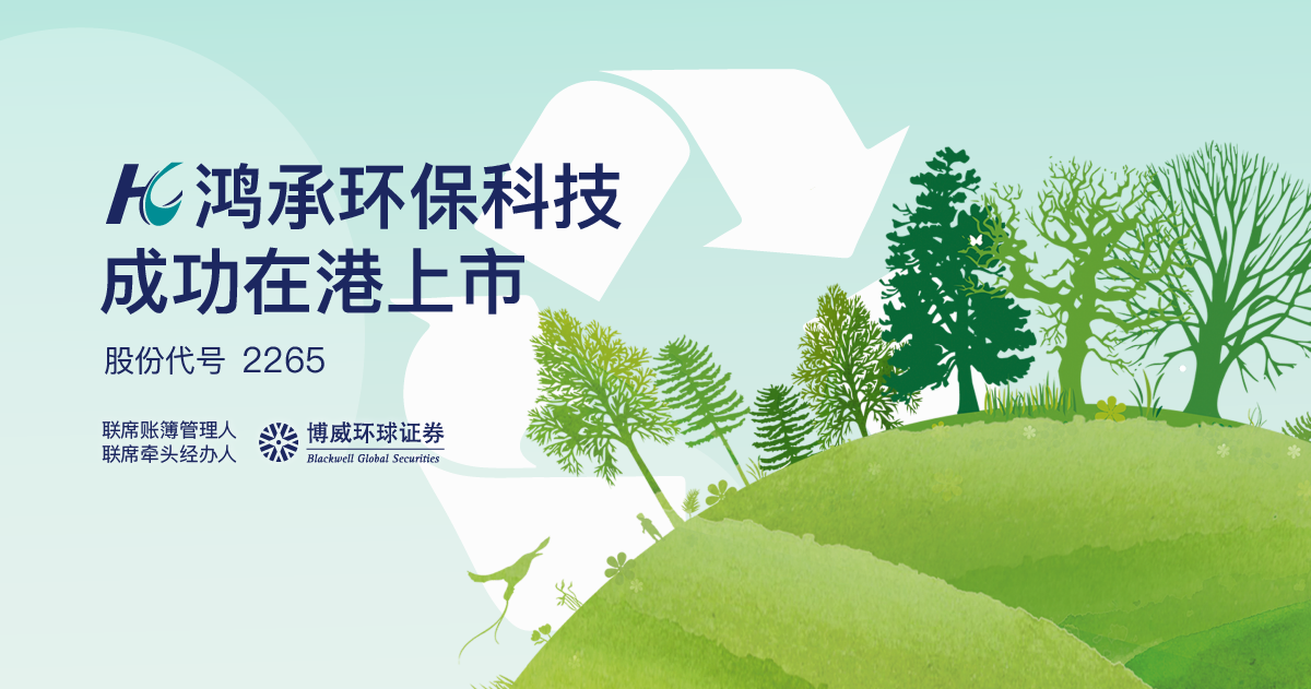 鸿承环保科技有限公司(“鸿承环保科技”) 成功于今日在香港联交所主板挂牌上市(股份代号:2265),博威环球证券有限公司(“博威环球证券”) 担任此次的联席账簿管理人及联席牵头经办人,助攻极具潜力的鸿承环保科技迈向国际市场。
