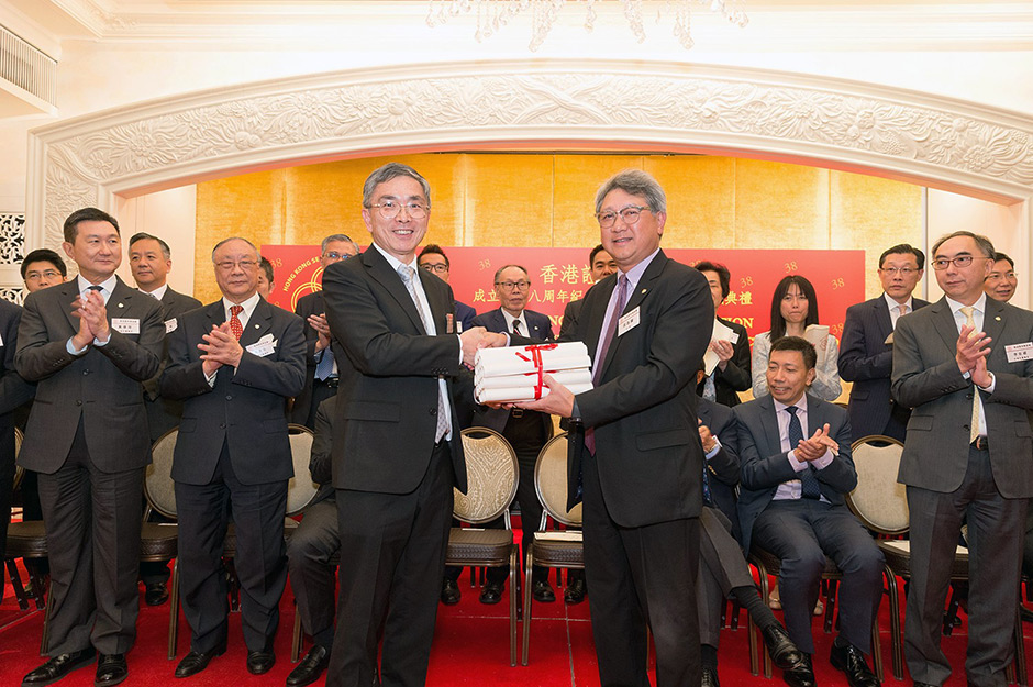香港财经事务及库务局局长刘怡翔(前排左侧)、香港证券业协会第20届主席张为国(前排右侧)