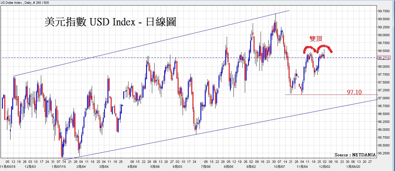 上周汇市走势可算是不太精彩,原因是上周是美国感恩节假期以及无大消息公布,令整个汇市交投清淡,窄幅上落。但从图表分析来看,显示了汇市的平静期快将完结,可参考下面的美元指数日线图,可见美元指数的走势形成了「双顶」,反映出本周美元指数本周有颇大机会向下跌,即意味着非美货币本周将有上升的动力。本周预计美元指数可能下试至97.10