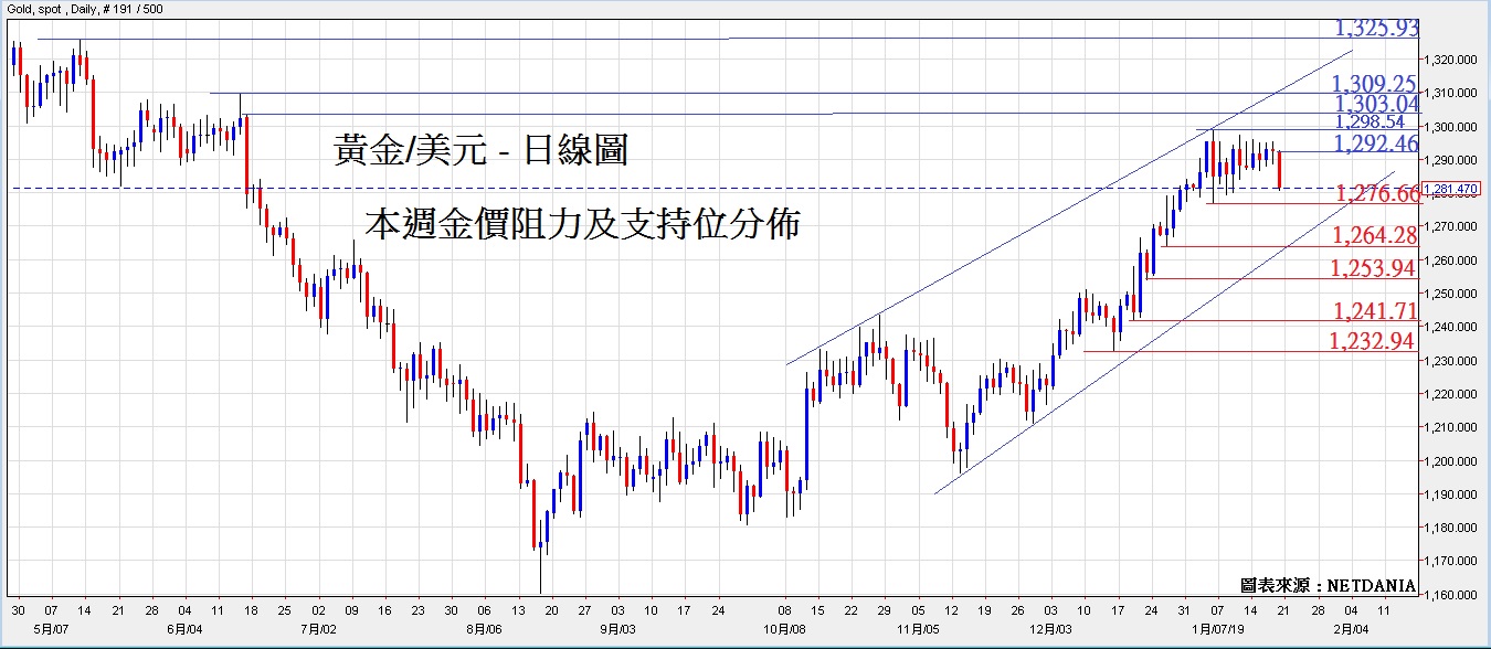 英国议会将推迟提交方案时间于1月29日对新的脱欧协议方案进行投票表决,上周三(16日)文翠珊安全度过了不信任动议,令镑汇回升,英镑兑美元在周五早上一度升近1.3000关口,由于避险情绪降温,令黄金下跌十几美元,周五收市报1,281。