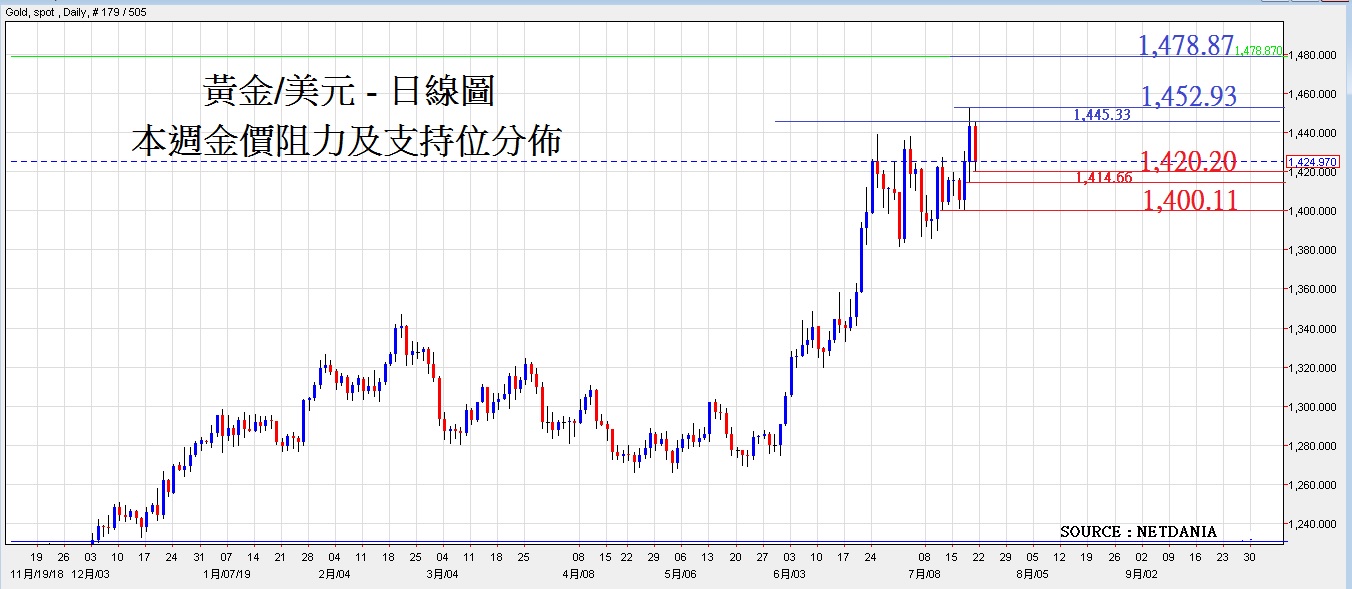 尽管市场对7月底美国减息充满憧憬,加上上周美联诸局三个巨头(主席鲍威尔、副主席克拉里及纽约联储银行行长威廉斯)均表态支持月底减息,在这股减息气氛下,理应对美元有一定的沽压。而另一边厢,欧洲央行则打算重启QE (Quantitative Easing 量化宽松)政策来刺激其疲弱多时的经济,一旦欧洲央行落实推行QE,欧元汇价将面临庞大的沽压,料间接令美元汇价大升。本周四 (7月25日),欧洲央行将会议息,有多家大型金融机构及银行,认为欧洲央行将会在当晚宣布重启QE时间表及规模,并预计最快在今年九月重启或最迟明年初。因此,本周四欧洲央行议息后的会后声明,若果真的正式宣布重启QE,预计市场将大手买入美元而沽出欧元,同时也间接令美元兑其他外币上升。因此,即使上周三及四有三位联储局重份量官员对月底减息言论放了「大鸽」, 美元在上周五最终亦反弹回升。美元在周中的确曾下跌过,美元指数曾最低见96.67,但由于欧洲央行或在本周宣布重启QE的压力下,令美元指数在周五回升。周五收市前曾上升到最高97.29,最后在97.07收市, 屹立在97水平之上。而欧元/美元方面,上周因美官员的减息明示下,令欧元曾升上最高1.1282 ,但最后亦下跌,周五收市报1.1217。所以,本周市场焦点除了是周二英国将公布首相人选外,欧洲央行是否正式宣布重启QE细节将会更被关注。