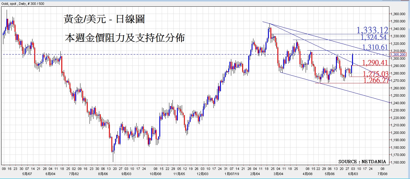 自从5月5日特朗普突然宣布对价值约2000亿美元的中国输美商品征收25%的关税后,令5月8日中美贸易谈判在华盛顿出现「反枱」局面,随后5月13日中国亦向美国实施反制裁,宣布对已加征关税的600亿美元清单的部分美国商品,分别加征25%、20%或10%的关税。此前加征5%关税的税目商品,将继续加征5%关税。上周中国向外放风,计划将限制稀土输往美国,限制稀土输美是中国反制美国的其中一个皇牌,中国会否实施将在短期内宣布,在中美双方互征关税及制裁后,负面情绪充斥环球金融市场。美股指数已从5月4日开始,由26,500㸃下跌至上周五(5月31日)收市在24,815,跌幅达1,685点子,在图表分析上,美股指数已跌破了重要支持线,跌势似乎将持续。美股的下跌也拖累了环球主要股市,令资金流入美元避险,导致美元汇价上升,避险货币中的日圆及瑞郎也受惠而上升,黄金则反复地上升,其他避险工具如主权国债,其价格也受惠而上升,令债息下跌。