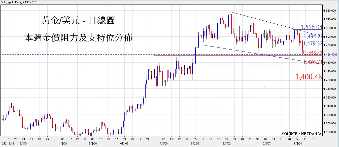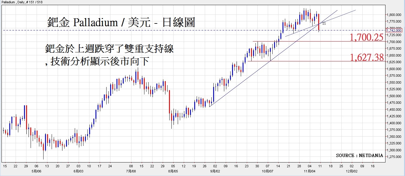 黄金上周连跌5日,跌幅合共56美元,而钯金(Palladium)在上周五(11月8日),一晚间暴跌了67美元,更跌穿了重要支持位,预计该两贵金属将持续下跌
