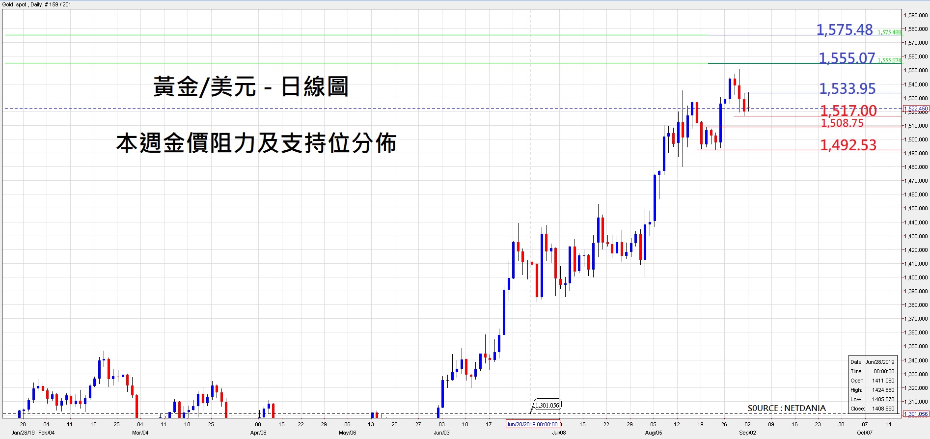 本周黄金阻力及支持位分布 :