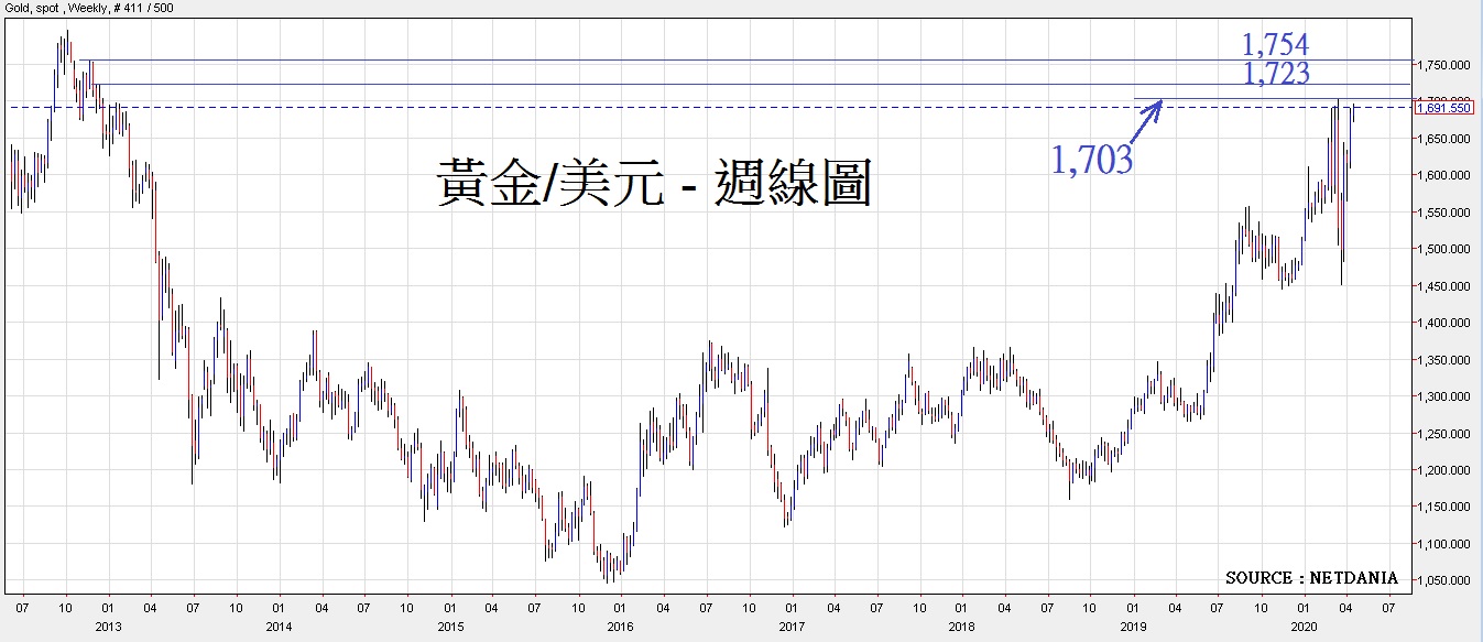 全球疫情仍处于爆发的高峰期,美国的死亡病例更升上第一位,似乎欧美将病毒受控的距离仍有一段日子,因此预计环球资金将仍然寻找避险为主,除了美元将会受惠外,商品中的黄金亦然。在3月9日,在爆发「美元抢购潮」之前,黄金曾因疫情初期爆发时曾升上1,703,及后因「美元抢购潮」令金价大跌。在现时疫情仍在扩张中,预计黄金将再展现第二波升浪,料黄金再上试1,703,若然升破,预计将上试第一目标1,723,再破的话,下个目标 1,754。