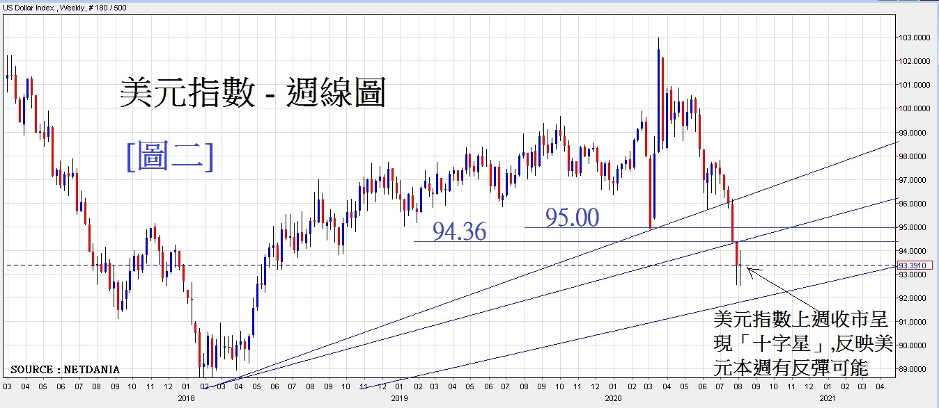 美元汇价方面,长线而言美元仍被看淡,但因近两个月跌势颇凌厉,亦已进入了「超卖」 形势。因此短期内预计美元会出现反弹,再者,见[图二],在美元指数(USD Index)周线图显示的阴阳烛, 上周一及五的收市价几乎是一致,形成了「十字星」,反映出美元指数有转势的可能,即是由早前的跌势转为升势,但因美国仍维持史无前例的量化宽松(QE),因此相信美元的反弹只属短暂。