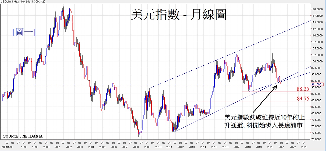 欧元/美元上升的主因是技术上美元已开始步入长远的熊市,正如[图一]所述。基本因素方面,现时美国为全球疫情最严重的国家,比欧洲还差一大截,美国经济再现下滑情况是难以避免,料美国未来将不断以扩大量宽政策来支持复苏,那就是美元未来将不断地下滑的主因。