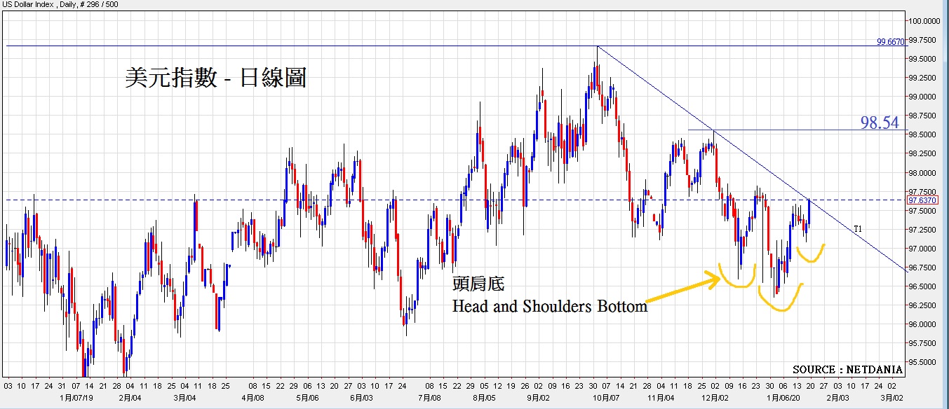 美国经济表现佳,支持了美元汇价上升, 美元指数或升破关键阻力,预计未来第ㄧ季内目标迈向100水平