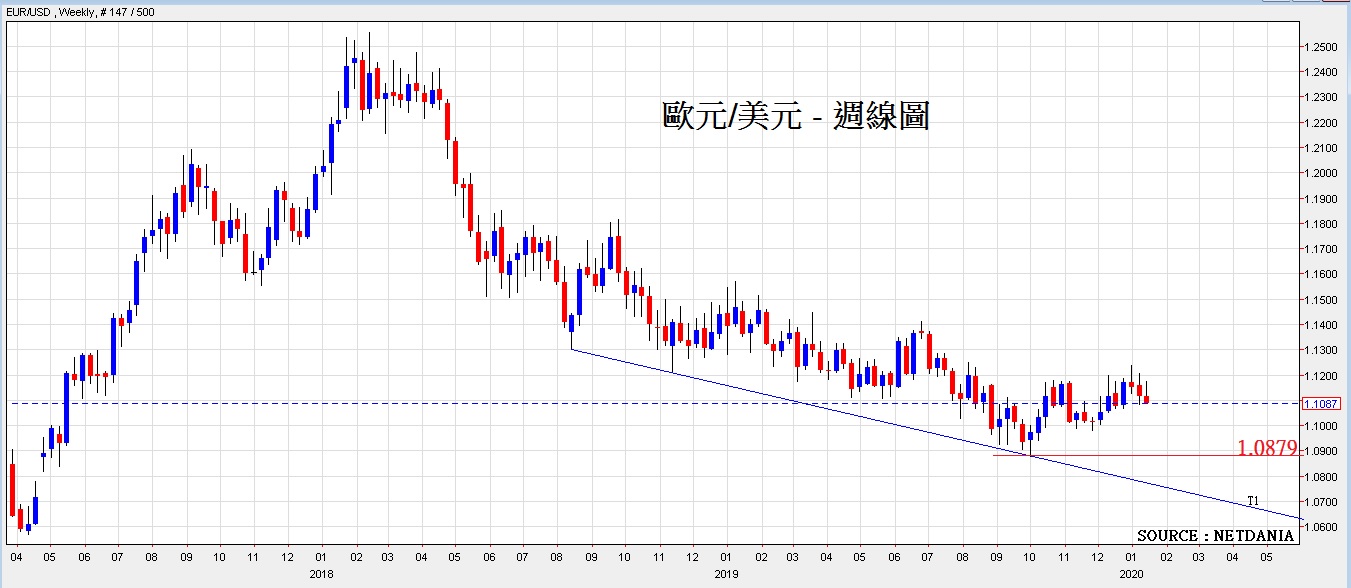 美国去年经过了3次减息后,其经济数据在2019年最后一季表现不俗,失业率仍低至3.5%,12月份非农业新增职位是增长14.5万个新职位,去年第3及第4季GDP仍然维持在2.1%增长;通胀率方面,更由去年10月份的1.8%,升至12月份报2.3%,以上的重头数据均显示美国经济发展平稳,支持了美元汇价强势。值得关注的是,是反映美元汇价强弱的美元指数(USD Index),在图表走势分析上,上周美元指数的收市价刚好收在下降通道的重要阻力位97.62 (可参考下图);同时以另一个图表分析来看,美元指数疑似组成了一个「头肩底」(Head and Shoulders Bottom),像似一个倒转的人,一个头及两个肩已形成,似在发展手臂位,即是将向上发展。以现时美国稳固的经济表现,美元指数进一步升破此关键阻力位机会颇大,若然升破97.62, 下一阻力为是98.54,如进一步升穿98.54阻力,下一目标是100。如果看好美元的升值潜力,那就应该选择 相对较弱势的货币去沽出(即买入美元/沽出外币)。选择沽售弱势的货币,建议可选择沽出欧元,因在七大工业货币中,欧元区经济表现算是最弱,尤其是欧元区利率现处于负水平,同时亦正进行QE (或称量化宽松),这两个货币政策均对欧元汇价带来沽压,所以如果以买入美元/沽出外币作为方向,沽出的货币建议首选是欧元。若然美元指数能成功升穿97.62重要阻力位, 预计欧元兑美元将下跌至1.0879。