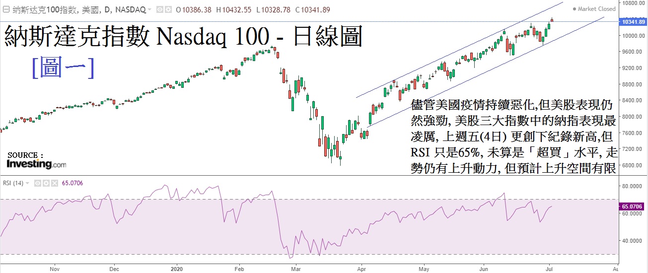 美国的疫情在过去一个月加剧恶化,上周四(2)新增确诊已超越了五万宗,周五(3) 更升至57千宗,死亡个案累计已超越了132千宗。美国国家过敏和传染病研究所主管福奇(Anthony Fauci)预计每日新增个案可达10万宗。虽然华府官员不断地强调不会因疫情停止启动经济,但市场郄一边厢买入美股,另一边厢同时买入黄金及其他避险工具以作保险,来预防美国政府万一重新实施封城;到时美股必出现大跌,持有避险资产可低消美股下滑的损失,可以说投资者又要惊,但又要玩。虽然美国新增个案屡创新高,但美股表现仍然不俗,当中的纳指(Nasdaq 100)上周更升至纪录新高;上周在1万点以上收市,收在10,341点。见[图一],其RSI65%,未算「超买」水平,似乎仍有上升动力,但料上升空间有限,预计升势将受制当RSI 升至70% – 73%