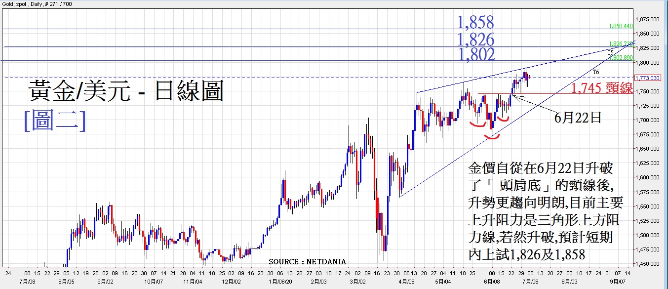 在众多避险工具中,如美元、日圆、瑞郎、黄金及美债等,以黄金表现最强。见[图二],金价自3月组成了一个倾向上升的敏感三角形,622日升破了头肩底的颈线1,745后,令后市升势更明朗,暂时上升仍受制于上升阻力线。上周三(71)曾尝试突破此阻力但未能成功,其后轻微回落,预计若然升破此上升阻力线,金价将挑战上方3个阻力位,第一 : 1802 ,第二 : 1826,第三 : 1,858