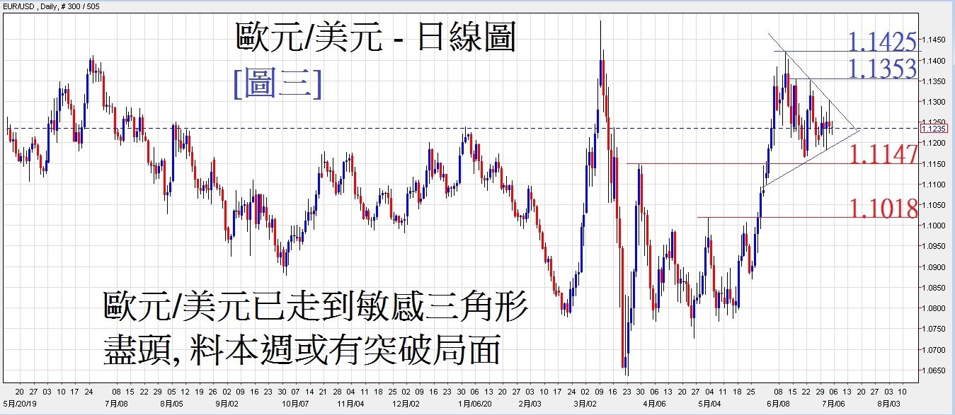 目前,仍有5个国家反对今次的超巨额救市基金,分别是瑞典、丹麦、芬兰、荷兰及奥地利。德国及法国,亦即是今次救市基金的牵头国,正积极派员去游说,至目前为止,这五国仍坚持投反对票。不过,德、法的游说仍继续进行,欧元未来的走势,是十分取决于今次救市方案能否通过。至于能否成功通过,实在难以推断,所以只能按图表分析去决定买欧元或是沽欧元。投资者在未有确定消息前,若看见欧元兑美元的三角形出现突破形势时可以跟势入市,即是若然升破三角形的阻力线便追买欧元,相反,跌破支持线便追沽欧元。