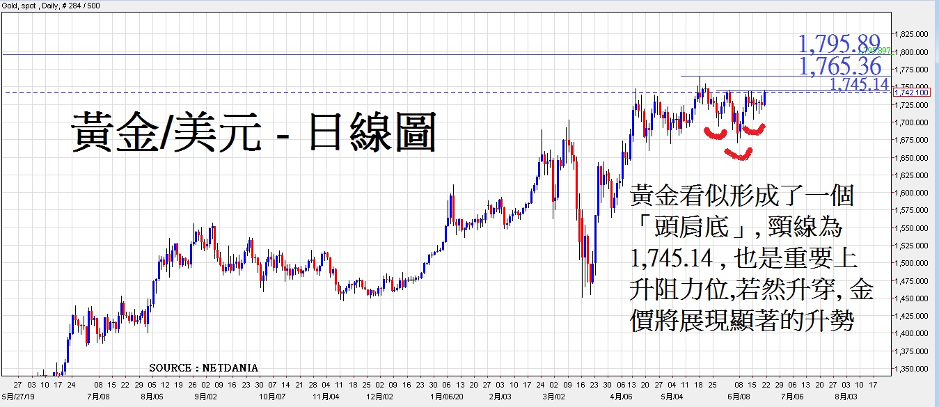 黄金方面,在上周五(19日)市场得悉美国单日确诊上升超过3万后,引发了避险情绪升温,令黄金受惠。当日黄金从1,722 升上最高1,745(重大阻力位),全日最多升近23美元,及后当晚在1,742收市。预计美国疫情持续恶化,将带动金价上升,金价上升的第一个大阻力是1,745.14。若然升破的话,将在测试上方的两个阻力位,分别是 1,765.36 及 1,795.89 。