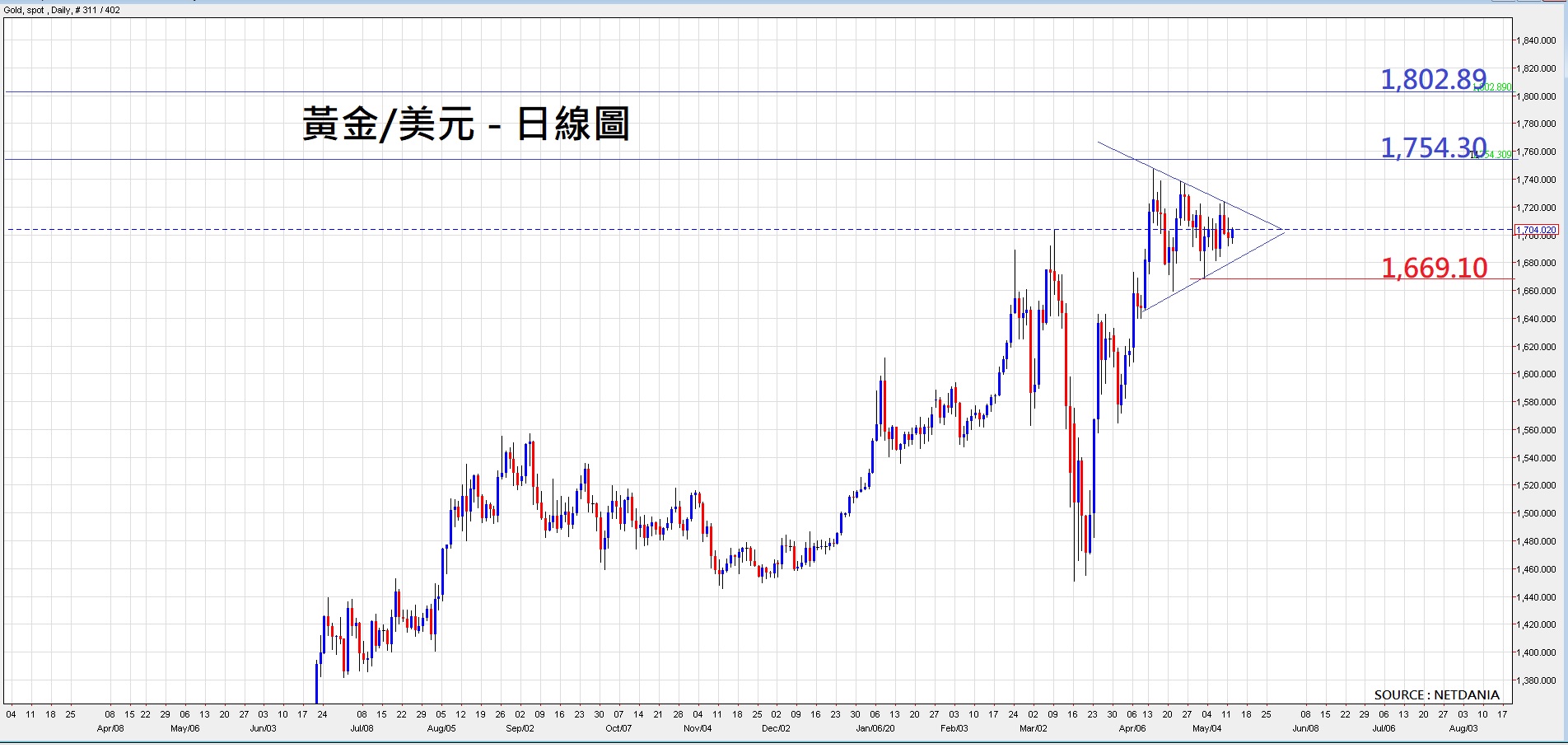 「敏感三角形」的形态出现,意味着黄金将出现大升或大跌的单向走势,利好或利淡黄金的消息可能一瞬间出现, 因此大家应有两手准备的心理凖备。