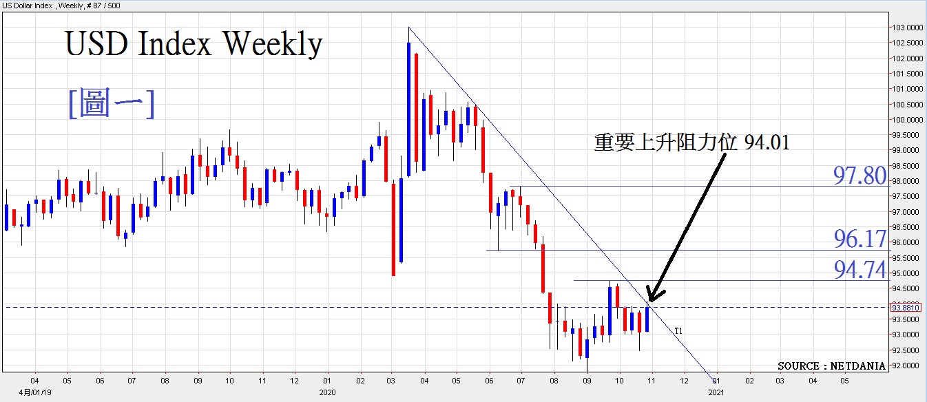 图表走势走势来看,见[图一] 尽管美元近日走势强劲,上周在日线图已升破阻力线,但在美元指数周线图中仍有一个重要阻力位94.07仍未有升破, 一旦升破,相信美元升势将更凌厉,非美货币将有显著跌势, 因此要留意USD Index 会否升破94.07