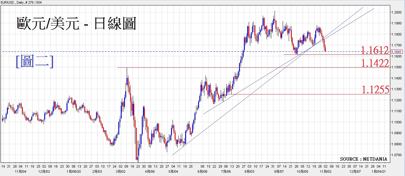 欧元方面, [图二] 欧元/美元周线图 ,下跌大支持位是1.1612,欧元若然失守跌破,预计欧元可跌至 1.1422或甚至更低。