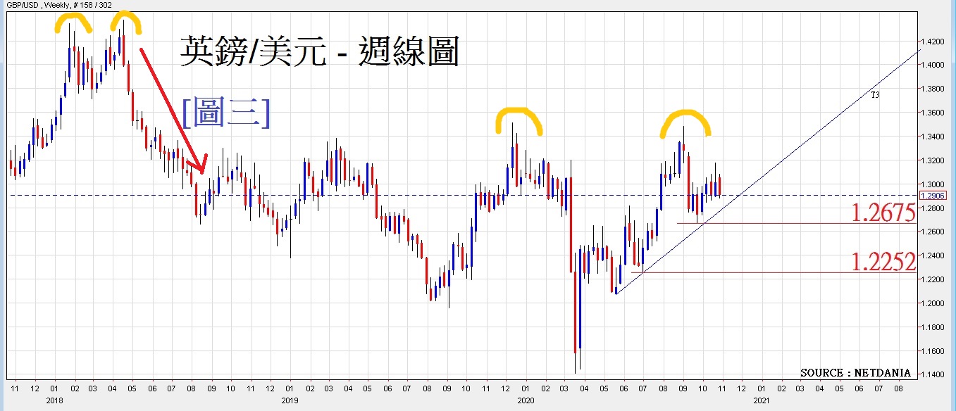 英镑方面,见[图三] 英镑/美元周线图, 图中显示,自去年9月及今年8月英镑分别造了两个接近相同的高位然后回落,形成了一个「相顶」,令英镑后市大幅继续回落机会更高,大支持位是1.2771,若然跌破, 预计英镑可能下跌至1.2252