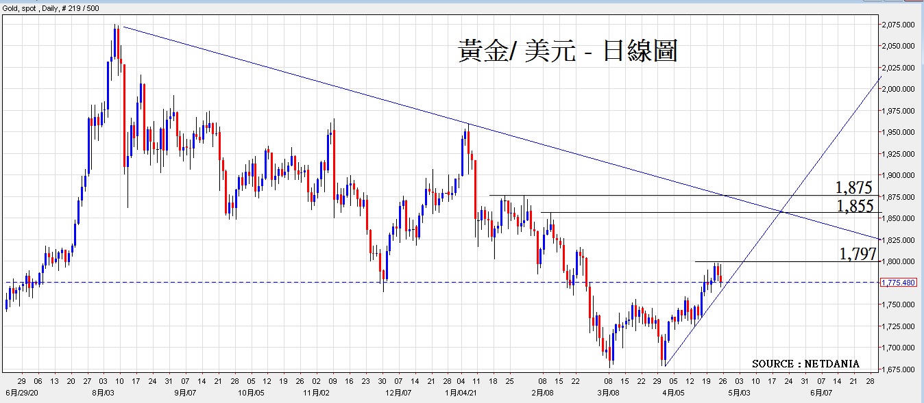 上周四(22日)俄罗斯宣布在乌克兰边界举行的军事演习已完结,即日撤回14万兵力返回基地,俄乌双方亦表示愿意会谈,令地缘政治紧张气氛稍作舒缓,金价亦因此在上周五稍作回落。但其他地缘政治气氛仍然紧张,如中国南海、台海方面,中美军舰依然活跃, 伊朗亦有向以色列核设施附近用导弹袭击,气氛仍然紧张。最令市场不安的,是过去一周全球新冠疫情感染人数不断创单日新高;最严重的印度,单日确诊高于30万人,情况已达到失控,市场亦揣测印度境内疫情有新的变种病毒产生,恐怕在蔓延至其他国家,加深了不确定因素。因此预计避险资金仍然将不断流入黄金。