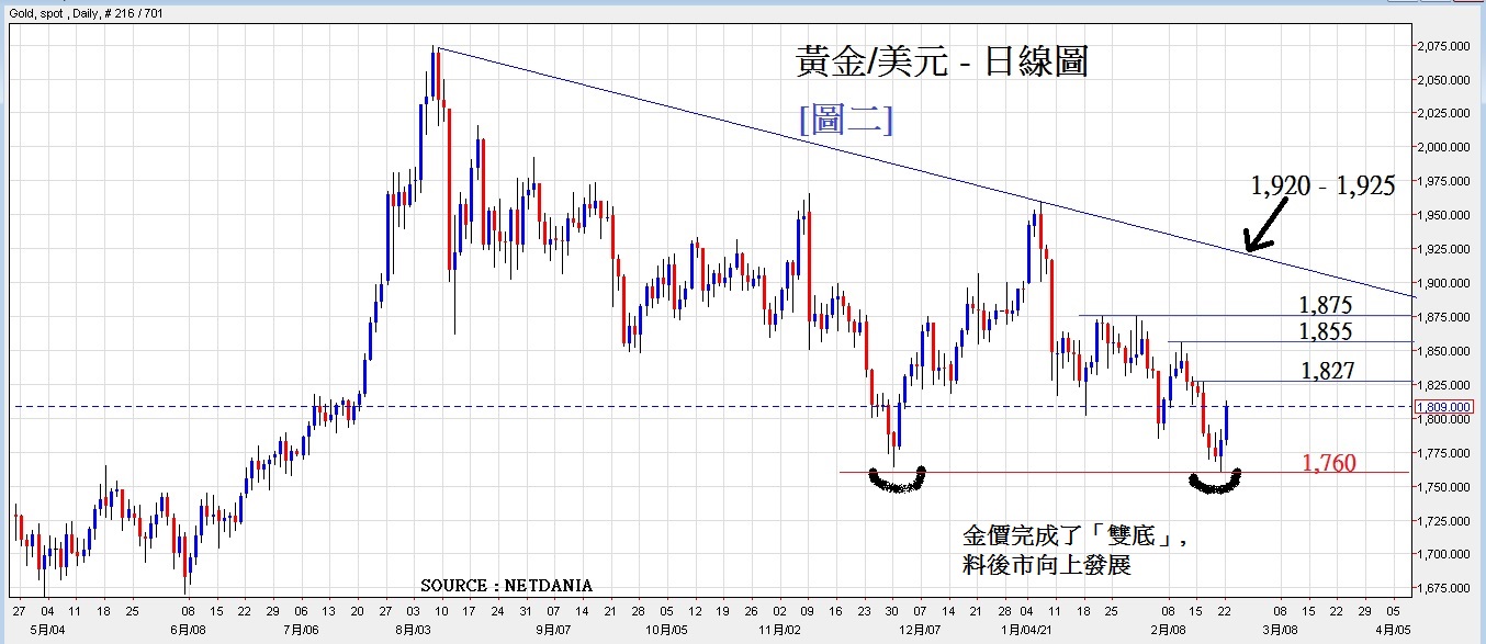金价技术分析方面,见[图二]黄金/美元日线图,金价在去年11月30日及上周五(19日) 分别造了两个接近同价的低位,形成了ㄧ个「双底」形态,料黄金后市持续上升,向上发展有4个阻力位,第一阻力是 1,827, 第二 : 1,855 , 第三 : 1,875 ,而特大阻力为 1,920 至 1,925。下跌特大支持位为 1,760。