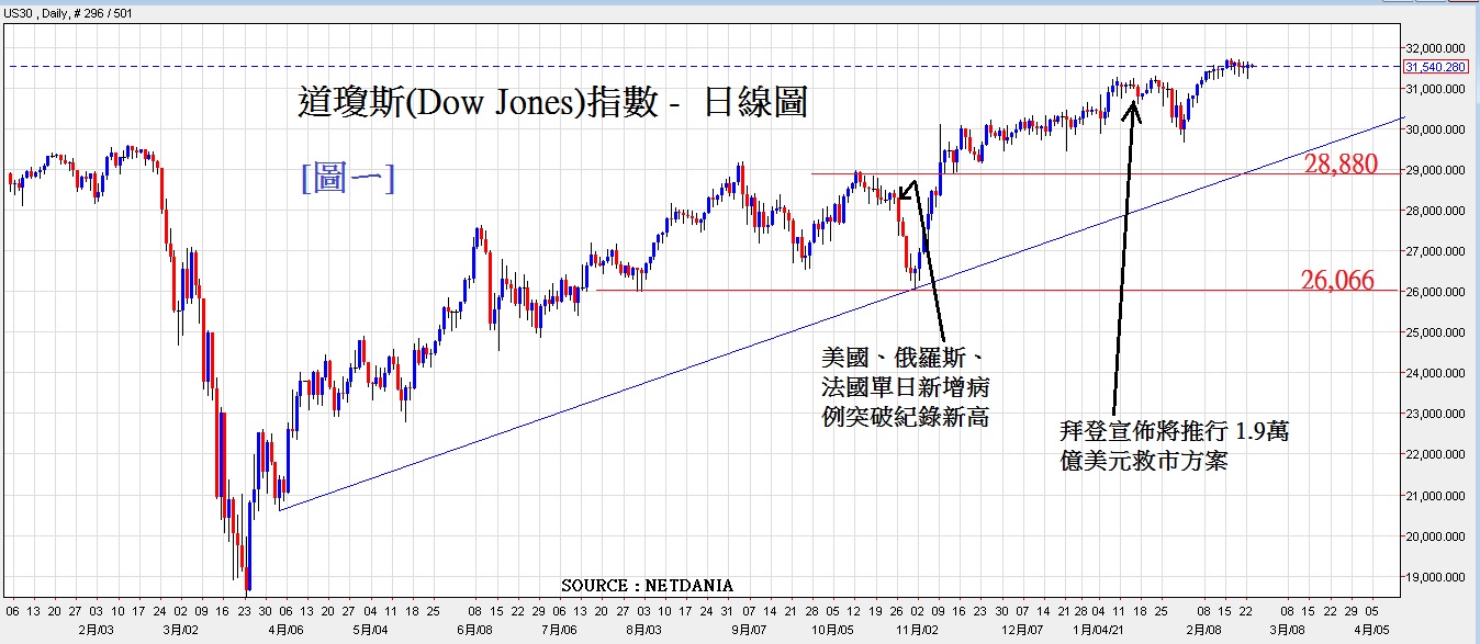 上周提过,美长债息率最近持续大幅飙升,令仍在高企的美股指数敲起了警号。适逢本周美国国会将会就1.9万亿美元救市方案作最后表决,但由于这个好消息已炒了一段时间,美股指数至今仍站近历史高位,故投资者要留意,美股可能会出现Buy the Rumor,Sell the Fact效应。而Sell the Fact就是1.9万亿救市方案获得通过,成为了事实后,投资者很可能将手上股票沽出获利,或令美股指数短时间内出现大幅回落,有可能「打回原形」,跌回去年11月初水平,即是疫苗诞生前的水平。见 [图一] 道琼斯(Dow Jones)指数日线图显示,若然美股下调,道琼斯指数可能下跌至 26,066水平,亦即是下调空间有20%之多。若然是小的回落, 预计下调至 28,880,即是下跌接近9%幅度。