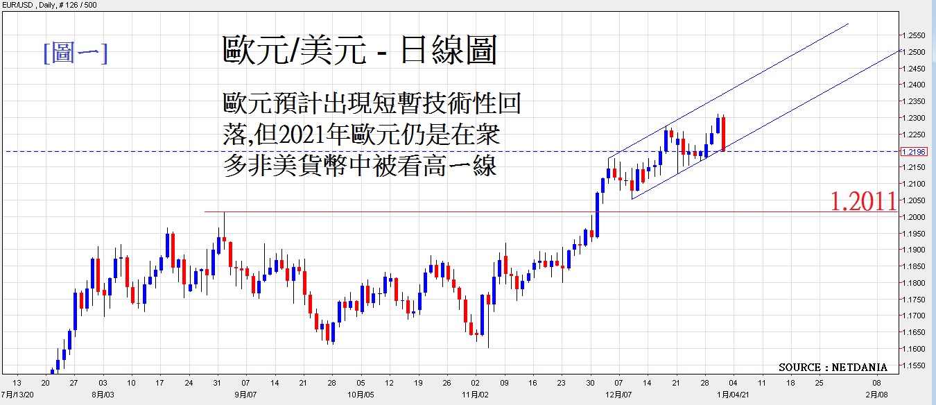12月初欧元/美元从1.2000水平一直上升至上周的最高位1.2310(近两年半新高)后,在上周四(12月31日)本年最后交易日出现显著回落,当日最高是1.2310,最后收在 1.2196,欧元单日跌幅超过100点子。相信欧元汇价下跌,是欧洲的疫情持续扩张所致,疫苗在欧洲被广泛使用的速度,相对较其他北美国家为慢。因此资金在避险情绪下买入美元而沽出欧元,但预计欧元此回落只属短暂性。