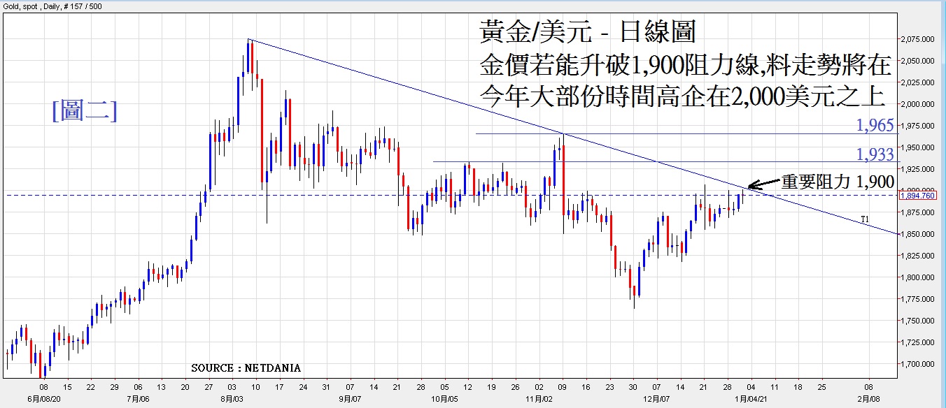 见[图二]黄金/美元日线图, 近日因欧美疫情持续恶化, 令金价持续高企。 图中可见,金价近日升到自8月向下伸展的下降通道的阻力线,上升阻力位约为1,900,若然能突破1,900,预计金价将重新再进入牛市,若然能升破1,900,料短期内将上试1,933,若然再上破,料继而进ㄧ步上试1,965。