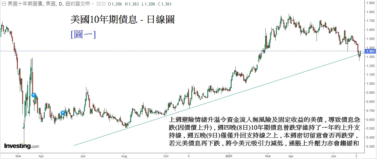 近日多个不确定因素笼罩市场,令资金涌入避险工具如美债、黄金及日圆,导致美债息下跌,金价及日圆汇价上升。预计避险情绪本周持续升温。主要疑虑有两个 : ㄧ)Delta变种病毒在多国急速扩散,市场忧新一波全球大流行Pandemic或再爆发。二) 美国债务上限快将在8月重启,但提升或延迟上限至今仍未有方向, 另外一万亿美债将在8月到期,市场揣测中国或大幅减少再购买,增添市场不安情绪。
