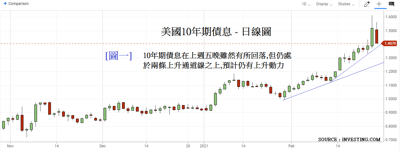 上周三(24日) 美股指数再创新高,道琼斯指数(Dow Jones)当日登上了历史新高32,009点,但在周四(25日)晚上因美国10年期债息急升,大幅由1.3690%,一度升越了1.5%心理关口,并收在1.5180%。美债上周四的急升幅度,可参考[图一]美债10年期债息日线图,周四晚由1.374%曾最高升上1.614%,最后在周五(26日)回落至1.407%收市,但仍在上升信道线之上,显示美债息仍有上升可能。