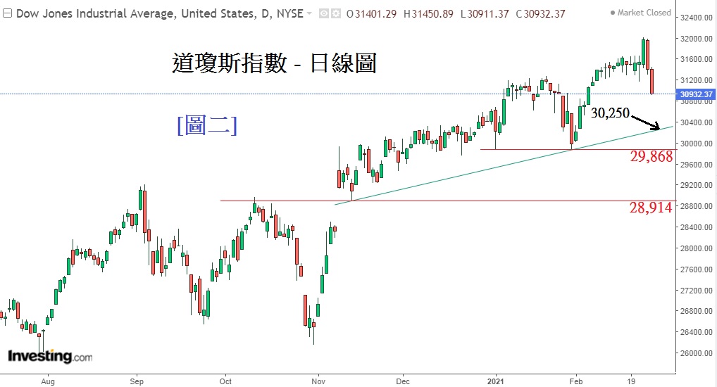债息升曾越了1.5%关卡,提升了市场对联储局可能今年提前「收水」(减少买债)的忧虑,因此触发了美股指数由历史高位大幅下跌。见[图二] 道琼斯指数日线图,图中可见,道指上周四及五下跌造成了两个颇长的阴烛,距离下面的上升通道支持线仍有距离,显示仍有下跌空间,上升信道支持线位置是30,250。这条支持线若然失守,道指将作更深的向下调整,下方第一支持是29,868, 第二支持是28,914。