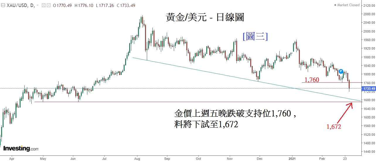 道琼斯指数上周四及五急跌,共下跌了1,052点(-3.3%)。 这次美股的显著下跌,避险资产中只有美元受惠而上升,过往一向在美股大跌时表现强劲的黄金反而大跌。上周四及五,金价共跌了73美元,相信是因为黄金无利息收益,所以市场避险资金选择买入近日隔夜拆息飙升的美元来避险,令金价下跌。见[图三]黄金/美元日线图,黄金在周五晚跌破了1,760支持位,然后收在1,733,预计金价本周持续下跌,料下探至蓝色的下降通道支持线范围,而在下方不远的红色支持线1,672为去年五及六月的反弹位,料将有强力支持,故建议把1,672为最后支持位,若然金价跌至1,672附近,可建立买盘,预计黄金的调整将止于此水平。