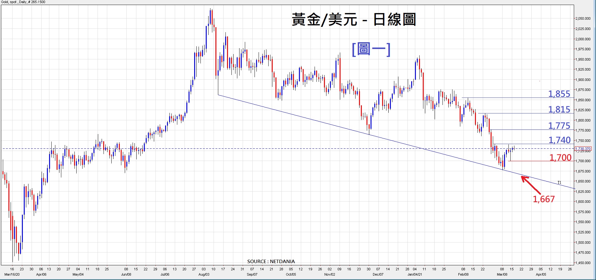 [图一] 黄金/美元日线图, 本周预计金价走势将由消息主导, 走势可能变得反复,进行买卖时留意阻力位及支持位分布。