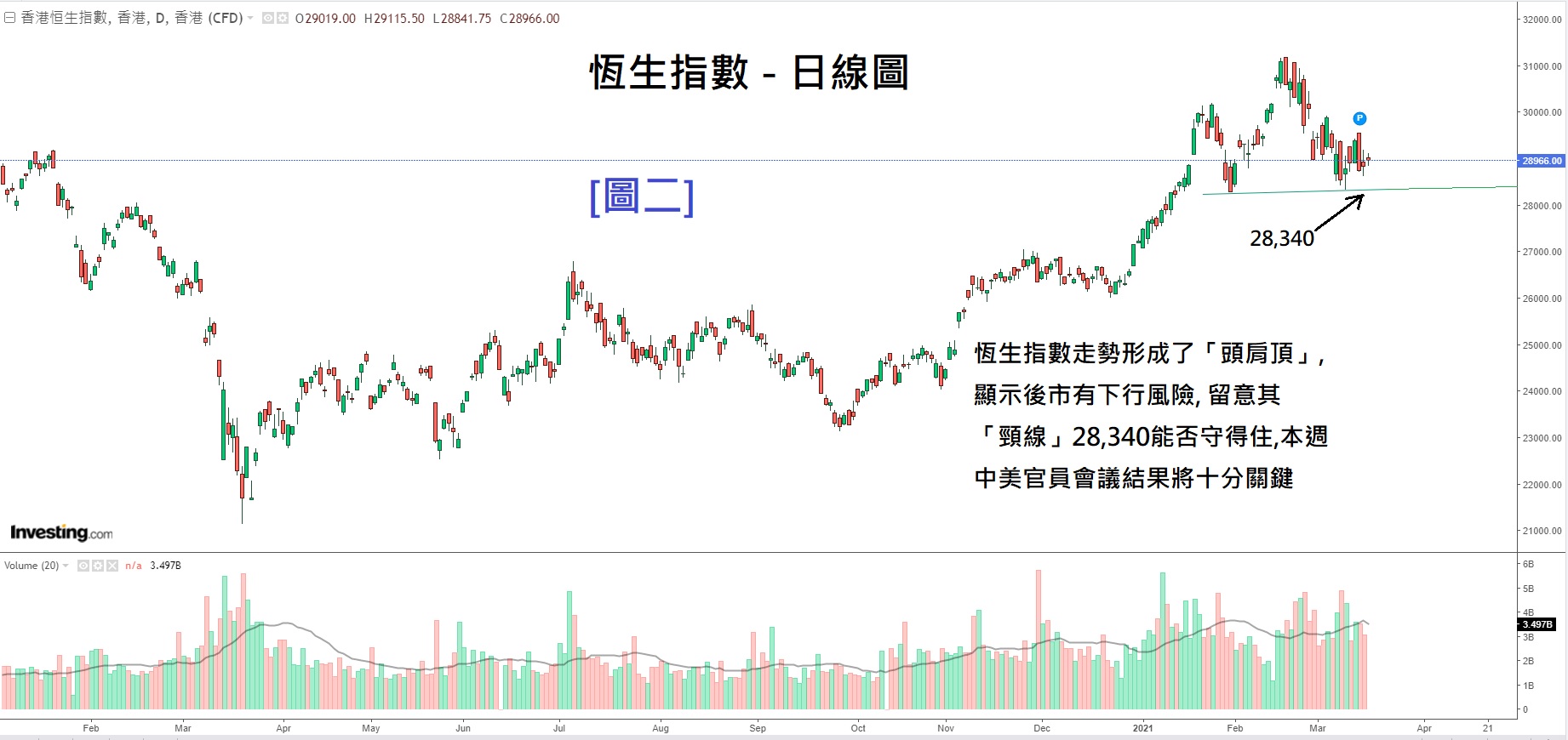 港股恒生指数走势形成了头肩顶,后市有下行风险, 留意其「颈线」能否守得住
