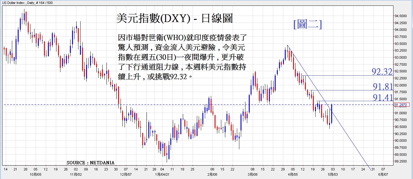 见[图二]美元指数日线图,因市场对世卫(WHO)就印度疫情的惊人预测,令美元指数在周五(30日)一夜间爆升,更升破了下行通道的阻力线,本周料美元指数持续上升,或挑战92.32。
