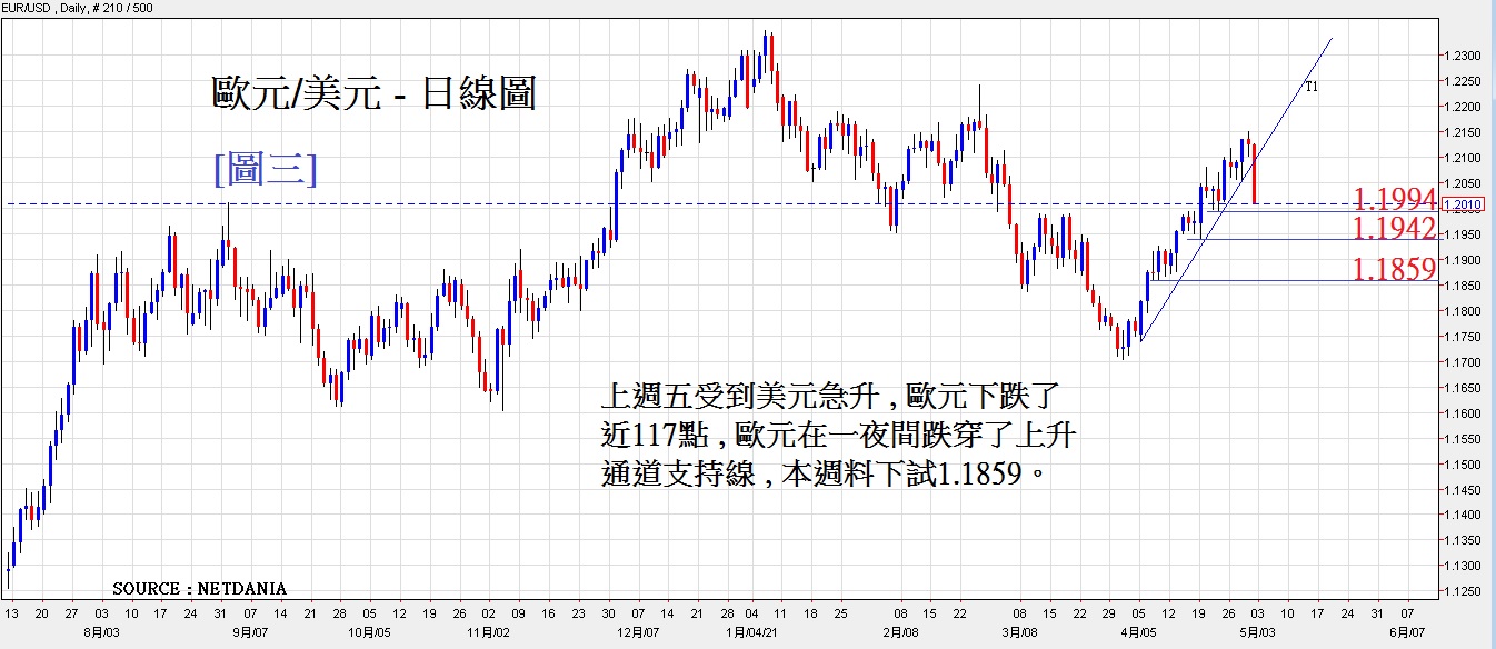 非美货币中的欧元方面,见[图三] 欧元/美元日线图,上周五受到美元急升,欧元下跌了近117点,也是在一夜间跌穿了上升通道支持线, 本周料下试1.1859。