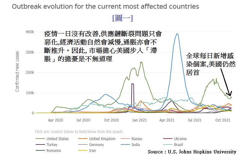 见[图一],美国每日新增感染个案接近10万人。令市场担心的是,目前尚未看到美国政府有计划作出ㄧ些更严厉的防疫措施、加上踏入冬季,新增感染人数料有上升之势。疫情一日没有改善,供应链断裂问题只会恶化,经济活动自然会减慢,通胀亦会不断推升。因此,市场担心美国步入「滞胀」的担忧是不无道理。