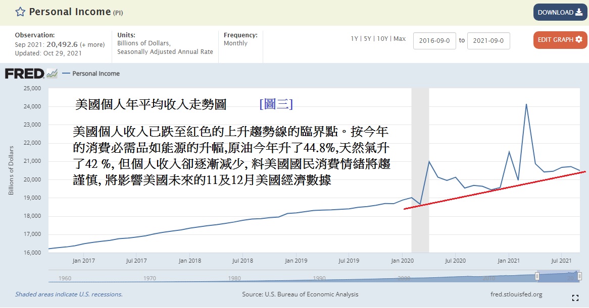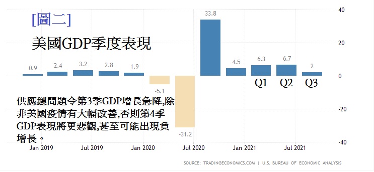 上周美国公布的第3季GDP急跌至只有2%增长,见[图二],相比第2季的6.7%增长,第3季的下跌确是有点儿多,距离出现负增长不远矣。供应链问题令第3季GDP增长急降,除非美国疫情有大幅改善,否则第4季GDP表现将更悲观, 甚至可能出现负增长。
