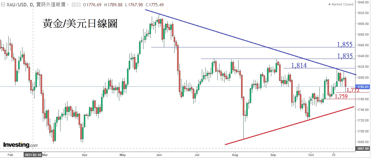 因美联储局「收水」在即,令美元受惠于上升。黄金上周有上升但仍未能升破敏感三角形的上升趋势阻力线,本周关注周四香港时凌晨2时联储局议息会议时公布减少买债日期及金额,目前市场普遍认为联储局将在11月实时减少买债150亿美元,并于明年年中结束买债。