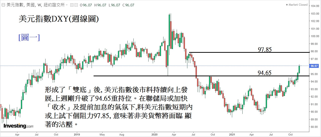 见[图一] 美元指数(DXY)周线图,在技术分析上DXY在形成了大型「双底」后, 美元指数后市料持续向上发展,上周刚升破了94.65重要阻力位。现在市场正炒着联储局或加快「收水」及提前加息的预期下,料美元指数短期内或进ㄧ步上试下个阻力97.85, 意味着非美货币将面临显著的沽压。