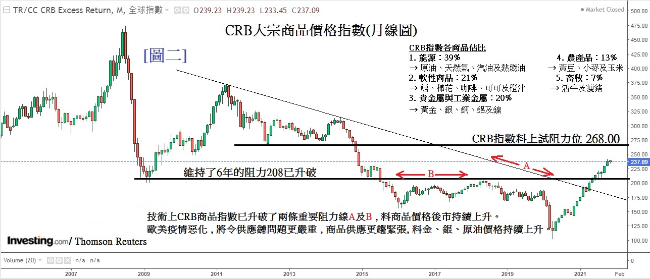 见[图二]反映大宗商品价格的CRB字指数月线图,技术上CRB商品指数已升破了两条重要阻力线A及B,料商品价格后市持续上升。