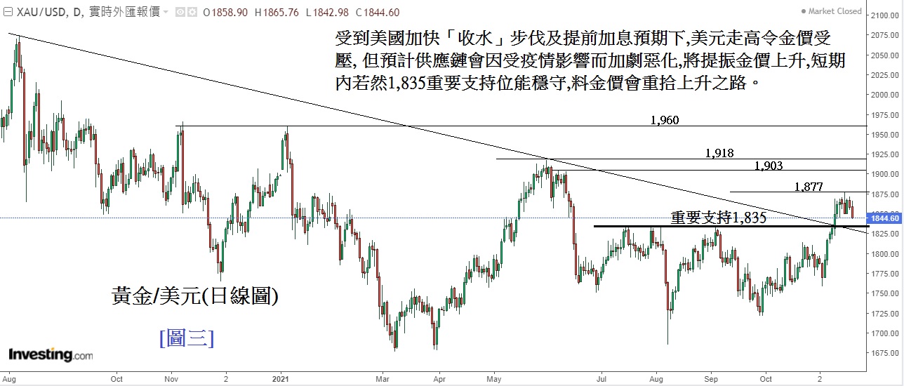 见[图三]黄金/美元日线图,受到美国加快「收水」步伐及提前加息预期下,美元走高令金价受压, 但预计供应链会因受疫情影响而再加剧恶化、将提振金价上升,短期内若1,835重要支持位能稳守,料金价会重拾上升之路。