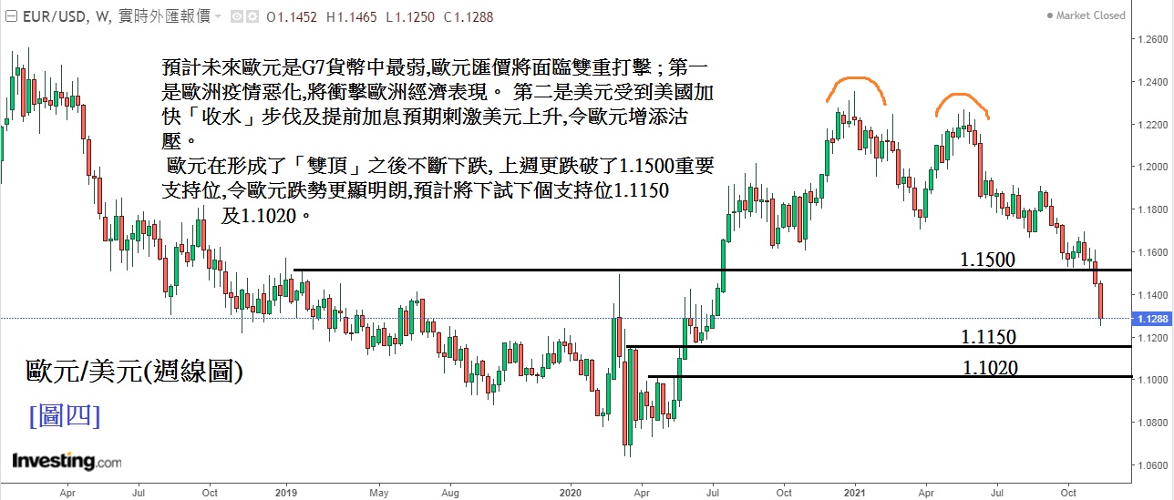 预计未来欧元是G7货币中最弱,欧元汇价将面临双重打击 ; 第一是欧洲疫情恶化,将冲击欧洲经济表现。 第二是美元受到美国加快「收水」步伐及提前加息预期刺激美元上升,令欧元增添沽压。
