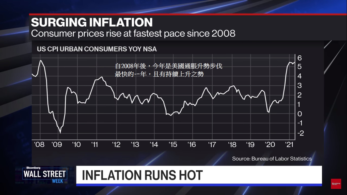 前周美国前财长萨默斯(Summers)接受彭博新闻访问时说 : 「美国现时的高通胀根本是长久性的,联储局应尽快动用措施内来压抑通胀。」 他暗示11月才进行减少买债还是太迟。美国通胀升势如何急速 ? 可参考[图一],图中可见,自2008年后,今年是美国通胀升势步伐最快的ㄧ年,且有持续上升之势,看来联储局快将「收水」的行动,似乎是势在必行,问题是每月减少买债的额度多与少。