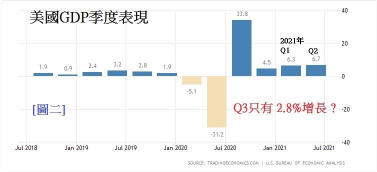 不过,因供全球应链问题影响下,导致美国经济在第3季表现下滑,见[图二]美国季度GDP表现,今年首两季均录得6.3%及6.7 %GDP增长。本来是表现不俗,但由于美国疫情在第3季持续恶化,每日新增感染个案近10万,影响了工业产出及供应链运作,导致经济表现下滑,市场分析预计美国第3季GDP增长只有2.8%,大大低于次季的6.7%,这触发了市场对美国或陷入「滞胀」的担忧。因此本周美国GDP结果将会是全球市场焦点。 若第3季结果是2.8%或更低,预计美元将会显著下跌,非美货币及金价料会有凌厉升势,尤其是黄金,因「滞胀」带来的风险下,避险资金将推升金价。美国经济有多差劲,密切留意本周美国GDP结果。