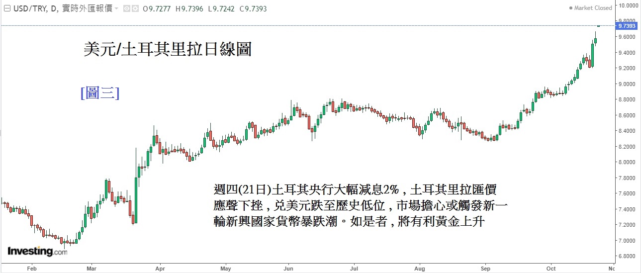 正当全球各国央行进行紧缩货币政策来压抑通胀之际,土耳其央行却在上周四(21日)宣布大幅减息2%。土耳其本身的通胀率已高达19.9%,已严重侵蚀国民收入,本应是采取加息行动来压抑通胀,因此土耳其总统埃尔多安下令这次大幅减息,消息震惊市场,令本身已弱不襟风的土耳其里拉兑美元跌至历史低点。可参考[图三]美元/土耳其里拉日线图 ; 图中可见上周四及五土耳其里拉出现急跌,上周土耳其里拉的暴跌,亦拖累了同是新兴国家货币的阿根廷披索跌至历史低㸃。因此市场关注度可能有新一轮的新兴市场货币暴跌潮出现。值得留意的是,过去多次的新兴市场货币风潮, 黄金都有显著的升势。因此,除了要留意美国的GDP表现外, 也要留意其他新兴市场货币表现。