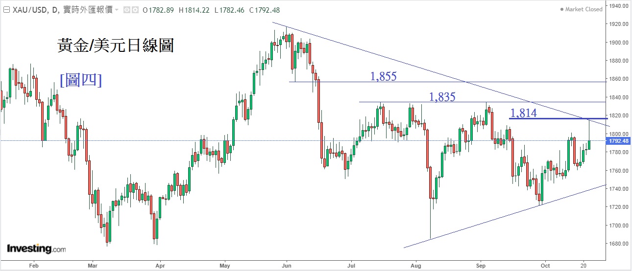 见[图四]黄金/美元日线图,上周五晚(22日)因鲍威尔释放「鹰派」言论,令金价由高位1,814迅速回落,但金价仍以ㄧ个「阳烛」收市,反映金价仍有支持。图中可见,即使市场正高唱联储局快将「收水」,令美元走强;但金价从10月起依然以上升为主,留意到每日的低位ㄧ日比ㄧ日高,显示金价有上升动力。