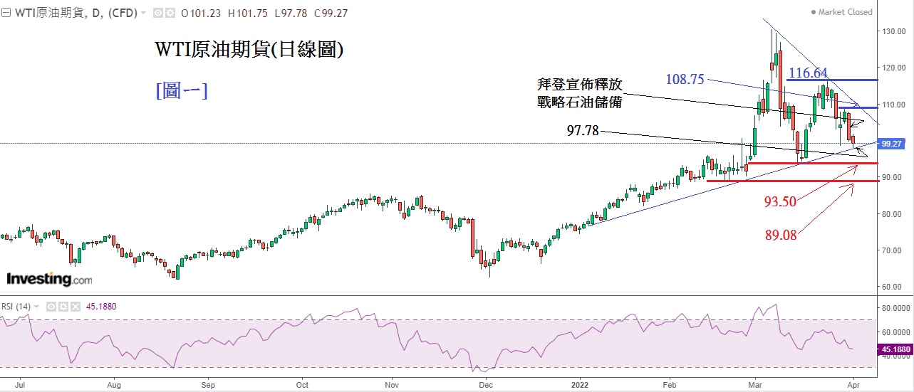 受到美国释放战略石油储备,油价下滑。俄国4月1日起只收取卢布作为支付货币,但多国仍未妥协,因此油价仍有回升可能,密切留意各国对俄的响应。