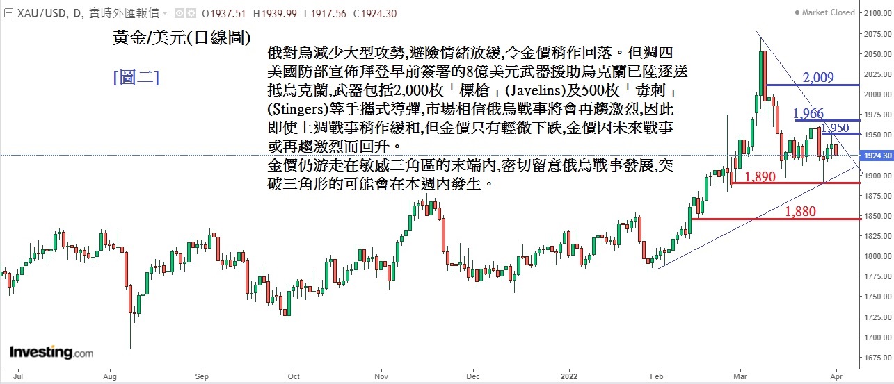 见下方[图二]黄金/美元(日线图),技术分析上,金价仍游走在敏感三角区的末端内,密切留意俄乌战事发展,突破三角形的可能会在本周内发生。