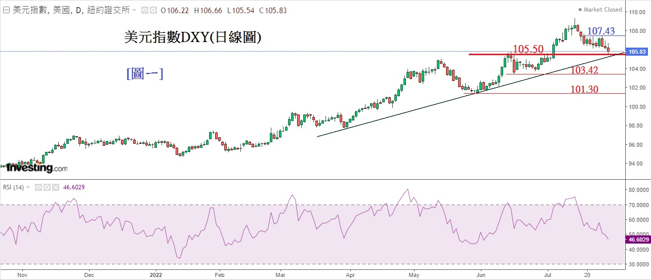 见下方[图ㄧ]美元指数DXY(日线图),黑线为上升通道线,红线为下跌支持,蓝线为上升阻力。