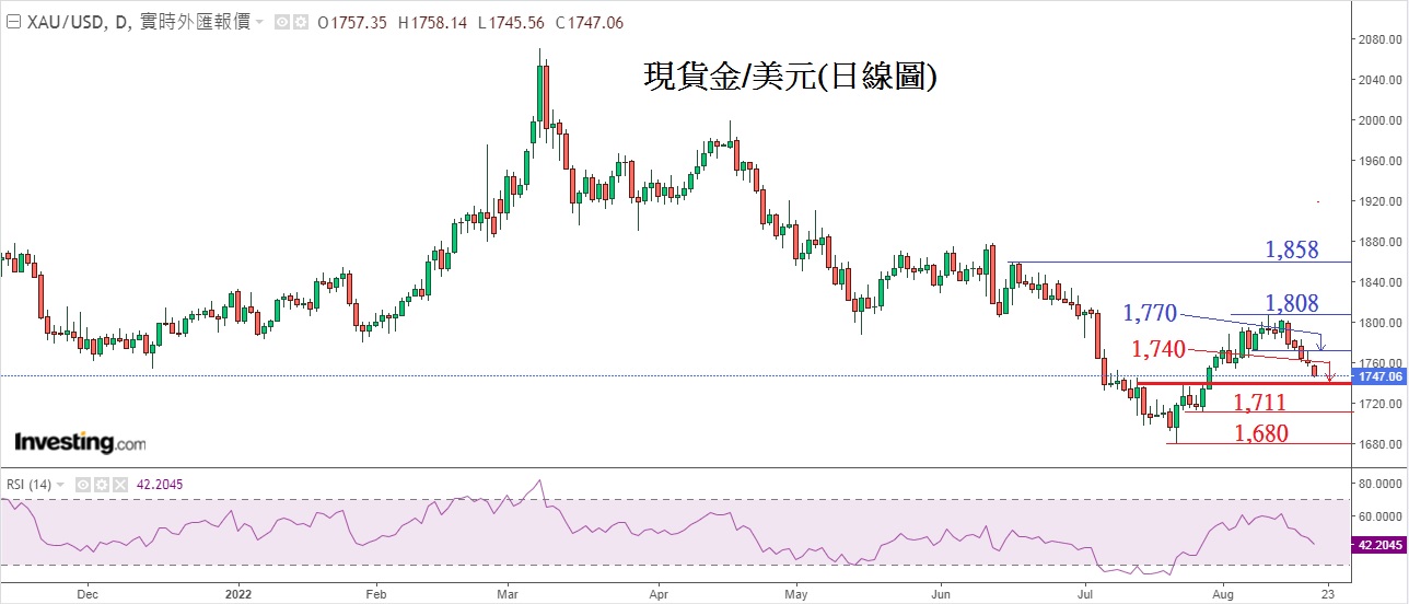 金价虽然因紧张情绪放缓而出现显著回吐,但未来台海局势仍然存在着政治及军事冲突等不明朗因素,因此料金价再下跌空间有限。同时预期全球通胀将持续上升及因美或步入衰退令美股指数大幅向下调整,抗通胀及避险因素将支持金价,因此对金价长线上升的看法没有改变。