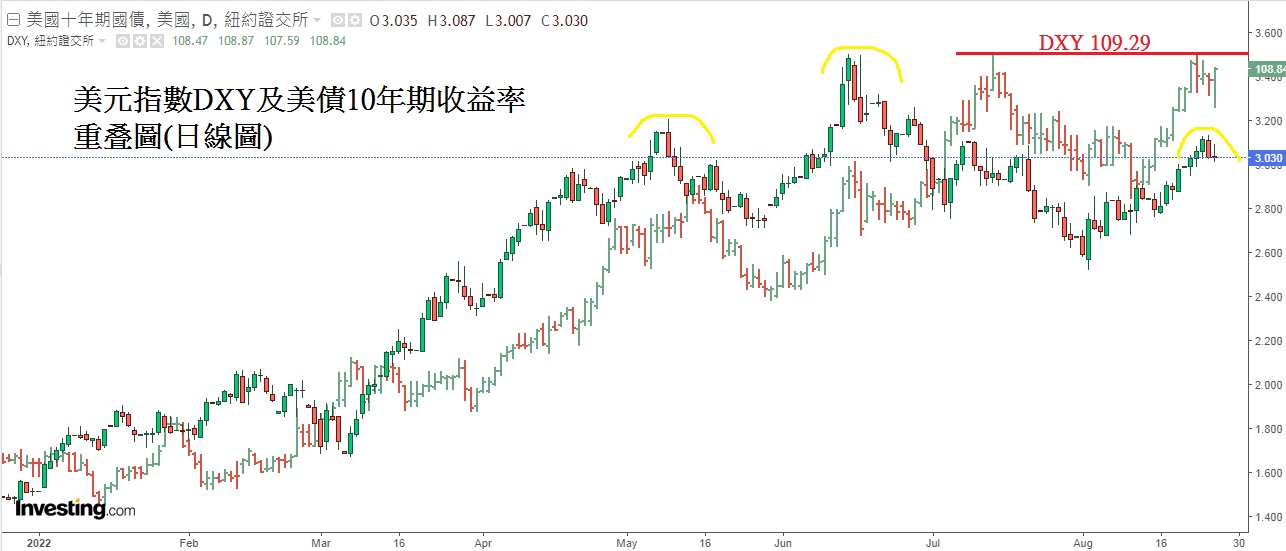 按技术分析来看,见下方[图ㄧ]美元指数DXY及美债10年期收益率重叠图(日线图)。 图中可见,美元指数DXY与美债10年期收益率走势ㄧ向是近乎同步。 值得留意的是,美元指数DXY近几个月在109.29的最高位分别造了ㄧ个的「双顶」,如图中的109.29以粗红线显示。除非109.29上破,即是上破「双顶」,否则美元指数DXY后市会有显著下跌,意味着金价及非美货币有大升的可能。